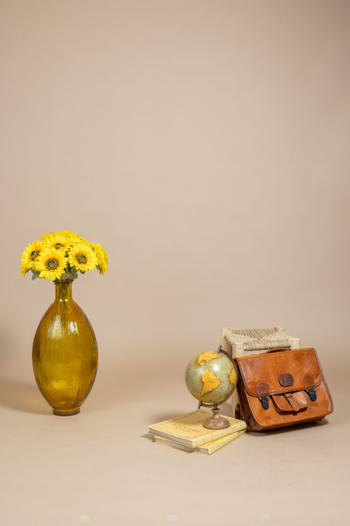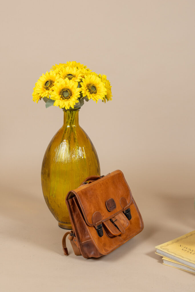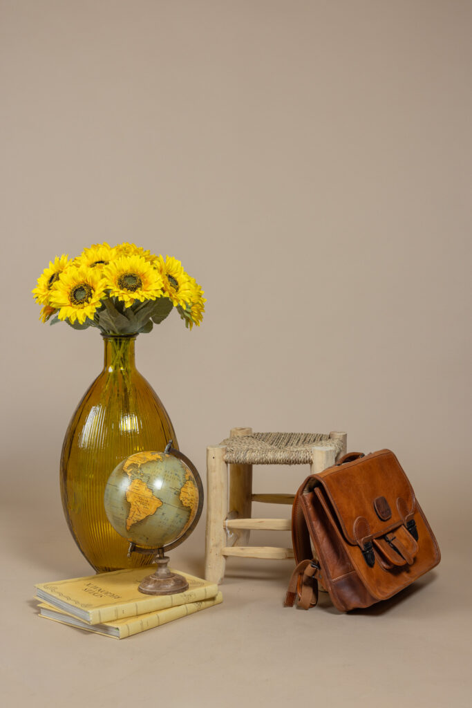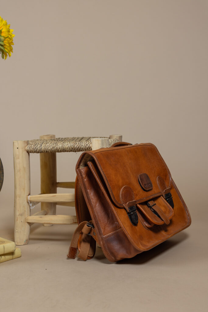 - Le cartable en cuir, clin d’œil à l’univers scolaire, intemporel et chargé de souvenirs.
